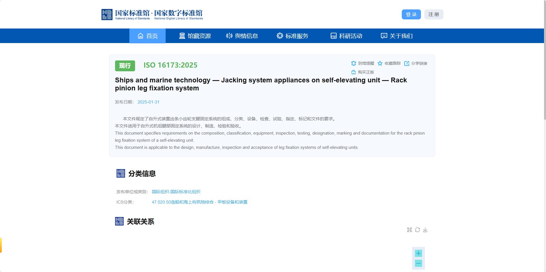 2025年1月,由廣東精銦海洋工程股份有限公司主導(dǎo)編制,聯(lián)合中國船舶工業(yè)綜合技術(shù)經(jīng)濟(jì)研究院、中國船級社和中山大學(xué)共同參與的ISO 16173:2025《船舶與海洋技術(shù)自升式海洋平臺升降系統(tǒng)齒條式樁腿鎖緊裝置》國際標(biāo)準(zhǔn)正式發(fā)布。